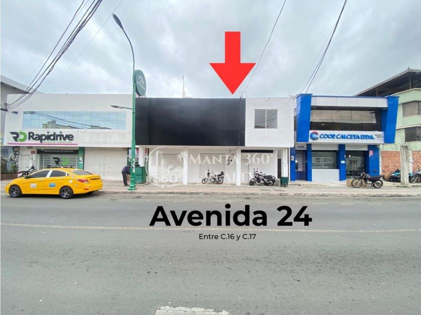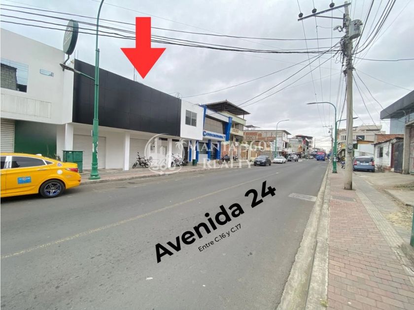 Ubicado sobre la Avenida 24 entre calle 16 y 17, este local comercial ofrece una de las mejores exposiciones del centro de Manta. Con un frente de 12 metros, fachada amplia en color negro y rodeado de negocios de alto flujo como Coop. Calceta Ltda. y Rapidrive, es un punto estratégico para marcas que necesitan visibilidad inmediata.